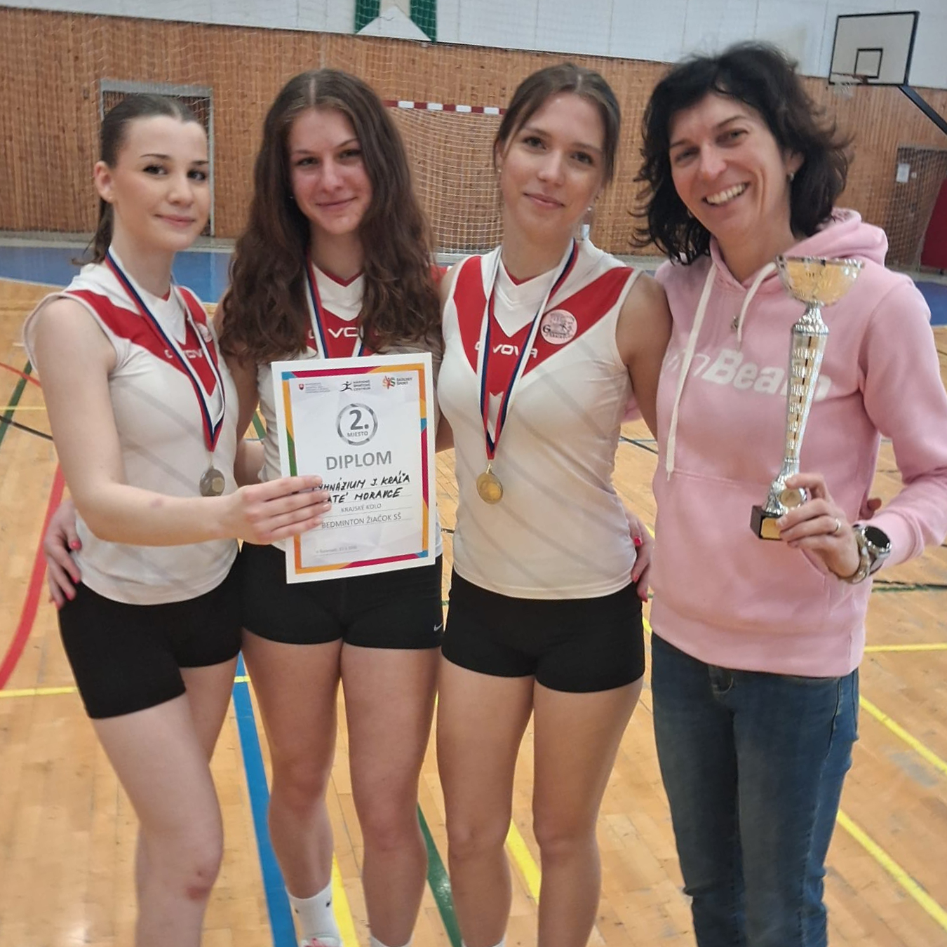 Naše šikovné dievčatá Ema Juhásová (IV. A), Ema Penzešová (IV. B) a Karina Kováčová (I. A) opäť potvrdili svoju kvalitu a bojovnosť. Na krajskom kole v bedmintone v Športovej hale v Šuranoch 17. 3. 2026 dosiahli výborný úspech, keď si rovnako ako predminulý rok vybojovali krásne 2. miesto.