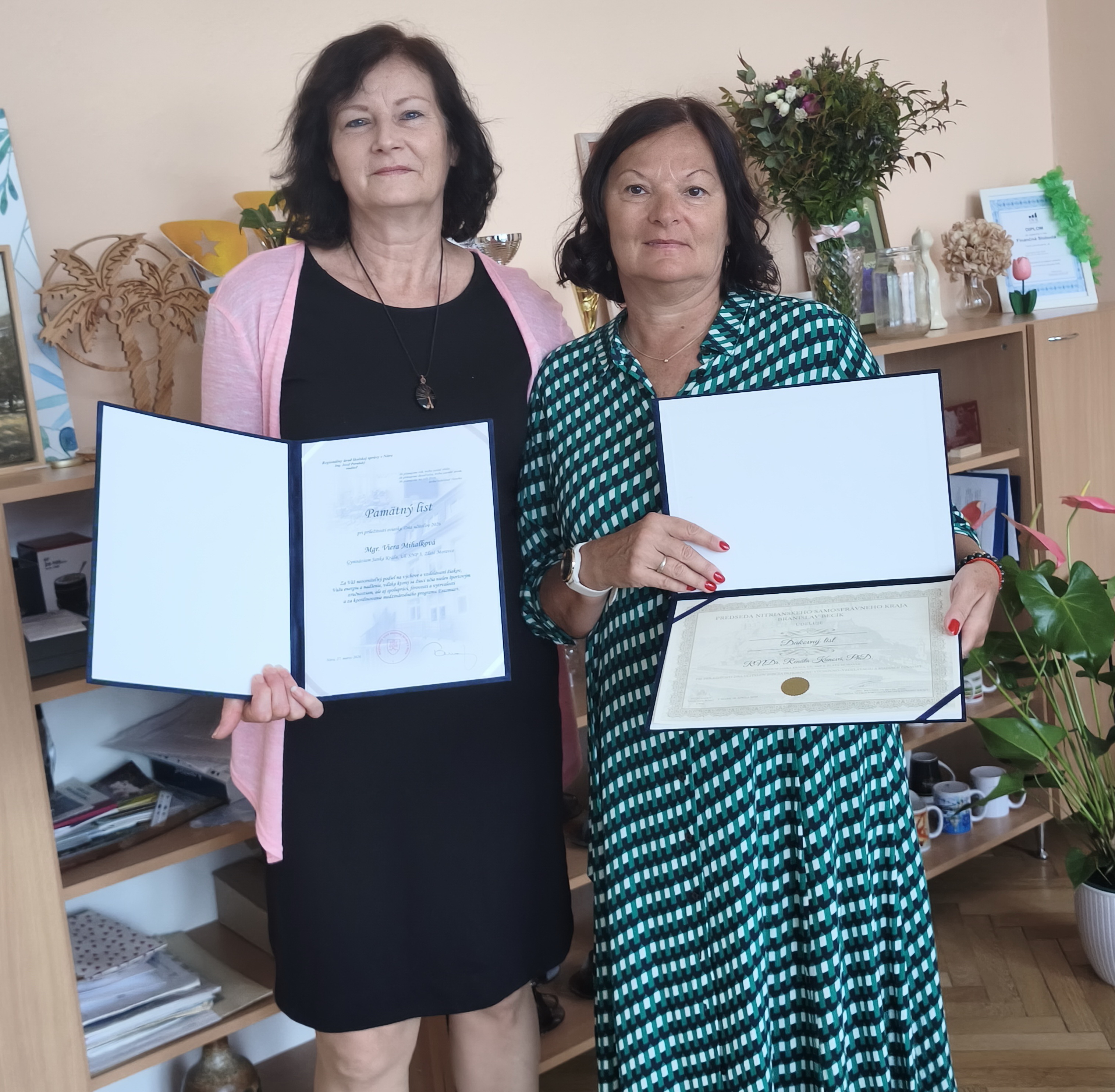 Pri príležitosti Dňa učiteľov 2026 bolo udelené ocenenie ako poďakovanie za dlhodobý prínos k rozvoju školstva v Nitrianskom regióne dvom učiteľkám z nášho gymnázia.
