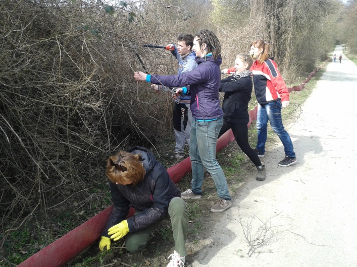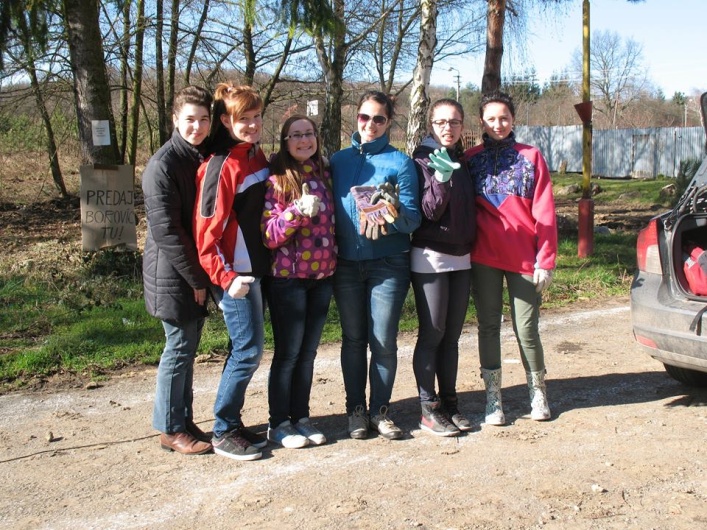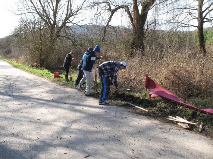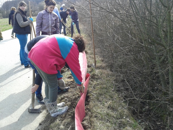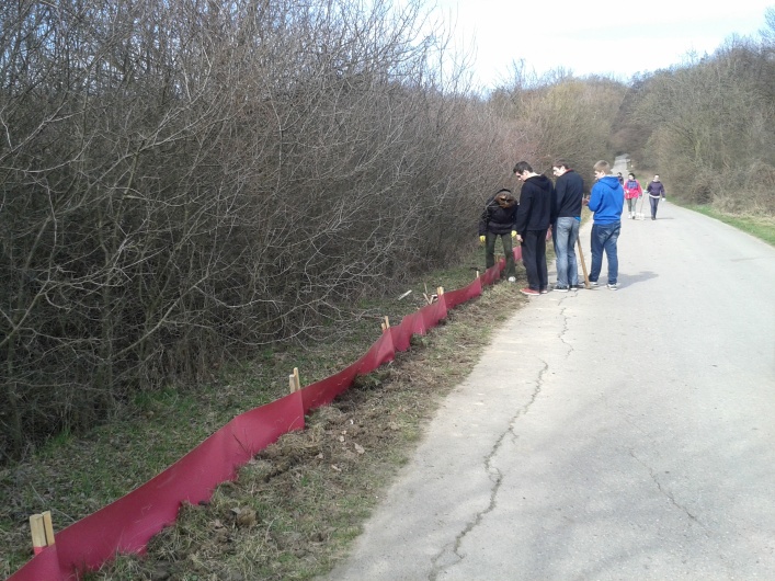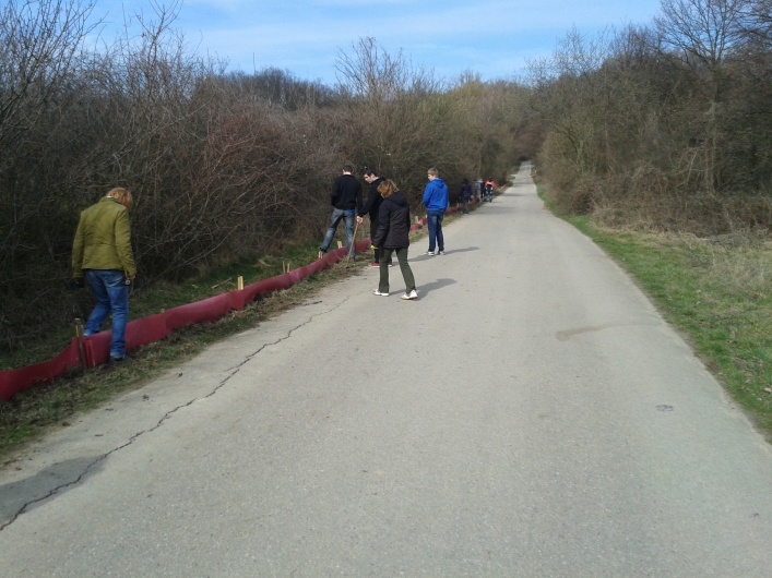 Žiaci II.B začali stavať 300-metrovú zábranu pre žaby, tým že robili ryhy do zeme Snažili sme sa myslieť aj ekologicky a to tak, že sme zbierali odpadky v okolí jazera Dievčatá nám na začiatku stavania zábran ukázali, ako sa vedia z práce radovať tým,  že sa nám usmiali do fotoaparátu a s veľkým nadšením  sa pustili do práce Pani profesorka nás aj počas práce kontrolovala a dolaďovala to, čo sa jej nepozdávalo Pri stavaní zábran  pre žaby sme museli čeliť aj prekážkam - neposedným konárom, ktoré vyčnievali do cesty Červenú fóliu sme pripevňovali tak, že sme ju z jednej aj z druhej strany pridržali drevenými kolíkmi a následne fóliu zahrabávali Konečný výsledok vyzeral tak, ako sme očakávali. Červená fólia bola potiahnutá pri ceste v dĺžke okolo 300 metrov, čím sme zachránili životy mnohých žiab a ďalší postup záležal už od dobrovoľníkov, ktorí prenášali zachránené žaby do jazera