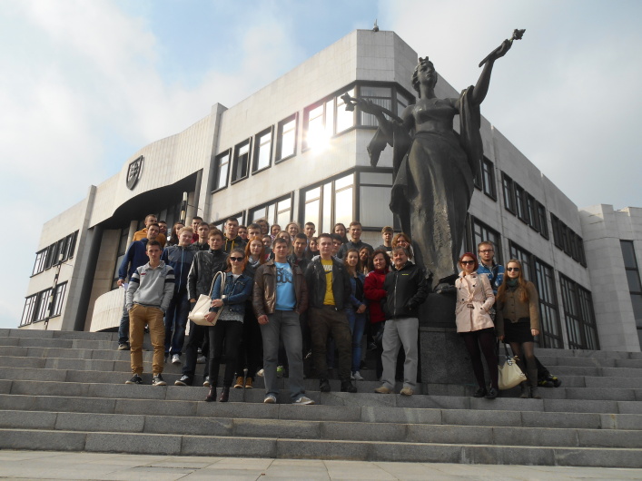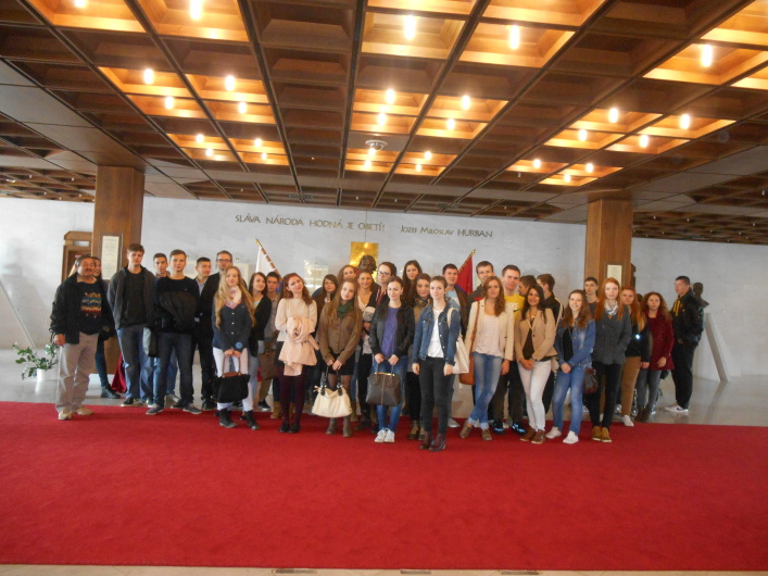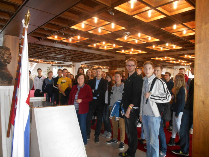 Študenti nášho gymnázia pred budovou NR SR Študenti vo vestibule NR SR Študenti vo vestibule NR SR Žiaci gymnázia za predsedníckym stolom v rokovacej sále NR SR