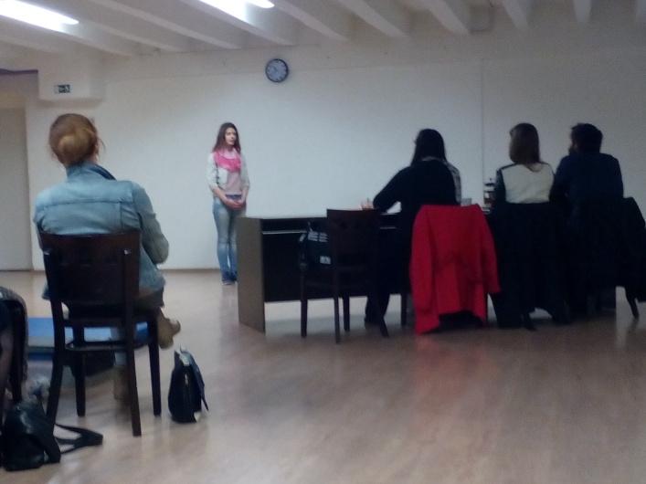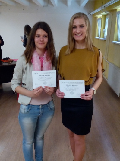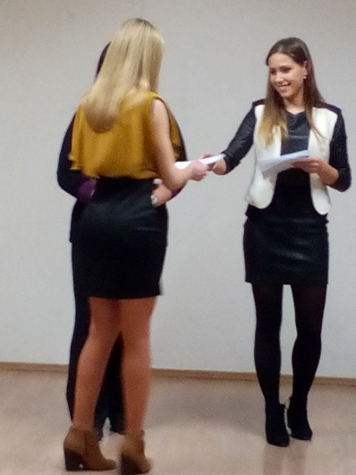 Katarína Halúzová prednáša pred porotou báseň Balada o matke v ruskom jazyku Katarína Halúzová prednáša pred porotou báseň Balada o matke v ruskom jazyku Jana Kaplánová prednáša pred porotou poviedku Váňka v ruskom jazyku Katarína Halúzová si preberá ocenenie za 1. miesto Spoločná fotka Kataríny Halúzovej a Jany Kaplánovej s diplomami
