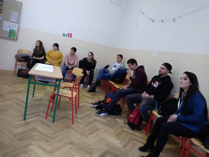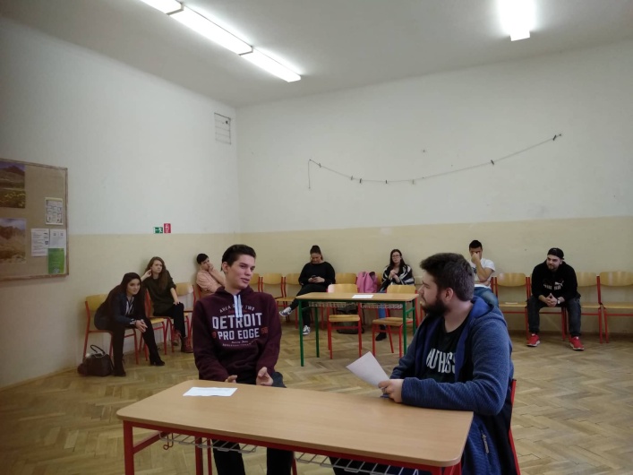 Účastníci súťaže čakajú v učebni Dvaja žiaci počas hrania rolí Spoločná fotografia víťazov kategórie 2A s diplomami a členov komisie Spoločná fotografia víťazov kategórie 2B s diplomami a členov komisie