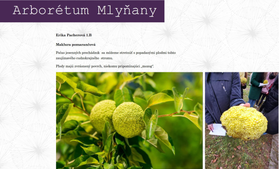 Na úvod nás privítali vedúci pracovníci Arboréta a poskytli nám propagačný materiál o miestnej dendroflóre. Odborný pracovník nám v rámci prednášky Jeseň v Arboréte objasnil zmeny, ktoré nastavajú na rozmanitých drevinách a zacielil sa na špecifické úkazy, ktoré sú viditeľné na listoch, plodoch a semenách. Po krátkej prestávke sme sa vybrali na prehliadku areálu s odborným výkladom a do pracovných listov sme si zaznamenávali odpovede.